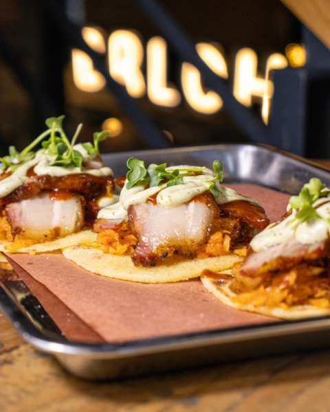 hovězí líčka z naší udírny (150g), domácí bramborové tacos, omáčka chimichurii, salát coleslaw, čerstvý koriandr, chipotle BBQ, sýr čedar, limetka